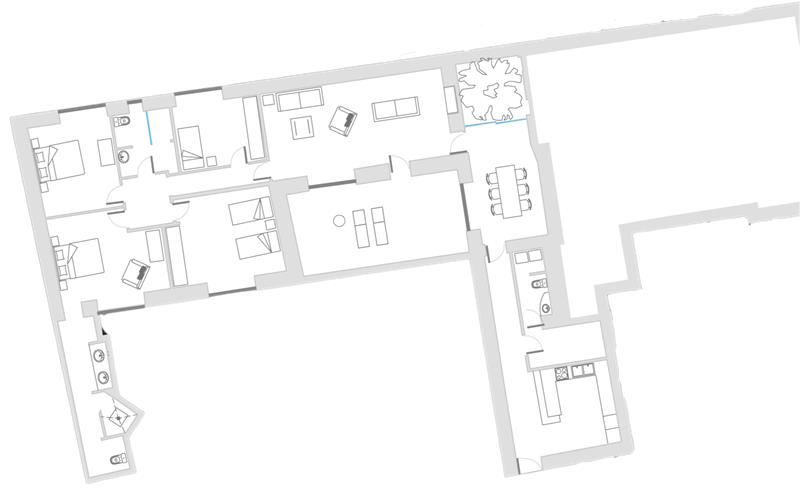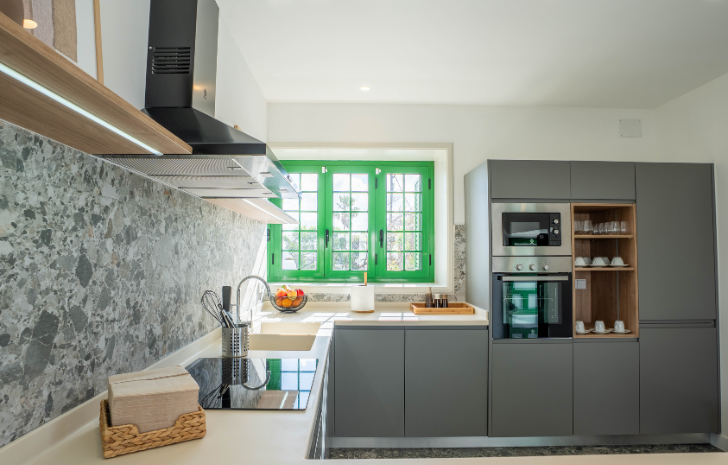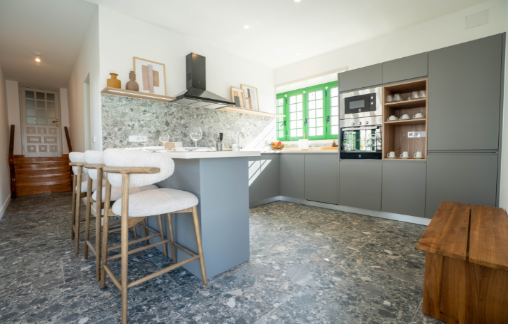 La cocina, con todo lujo de artículos y equipos, está acompañada de un práctico cuarto solana. Desde el amplio salón se accede a una terraza privada con dos hamacas y un relajante jacuzzi: el rincón ideal para disfrutar del sol y la tranquilidad.